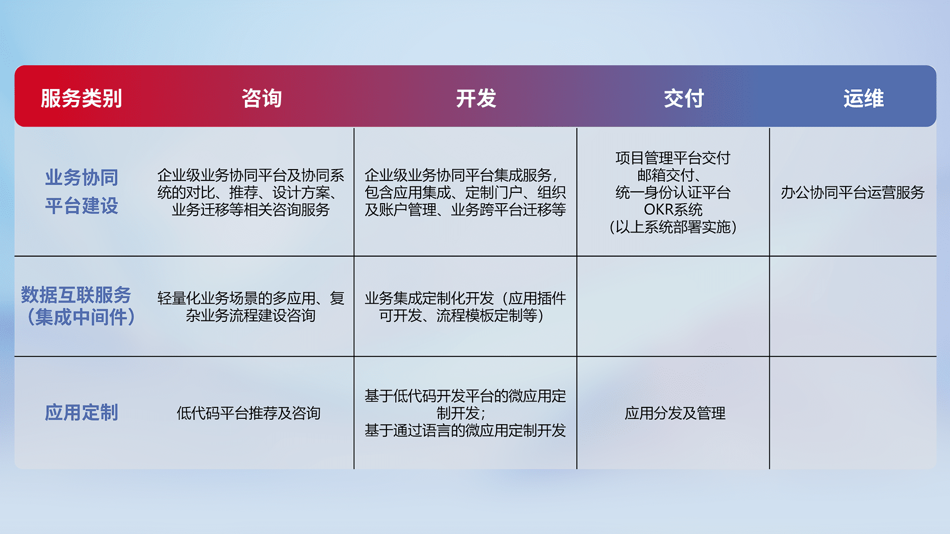 针对钉钉、、企微、、、IDaas等平台级产品提供产品的规划、、方案、、、、交付、、、、定制化开发等服务,,,,实现如统一协同办公、、、、智能客户服务、、、、混合会议管理、、、智能数据查询、、、、等业务场景,,实现数字化转型。。。。